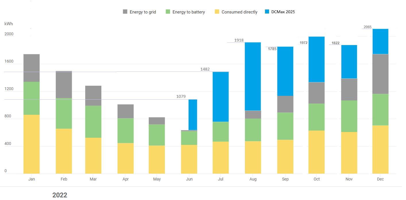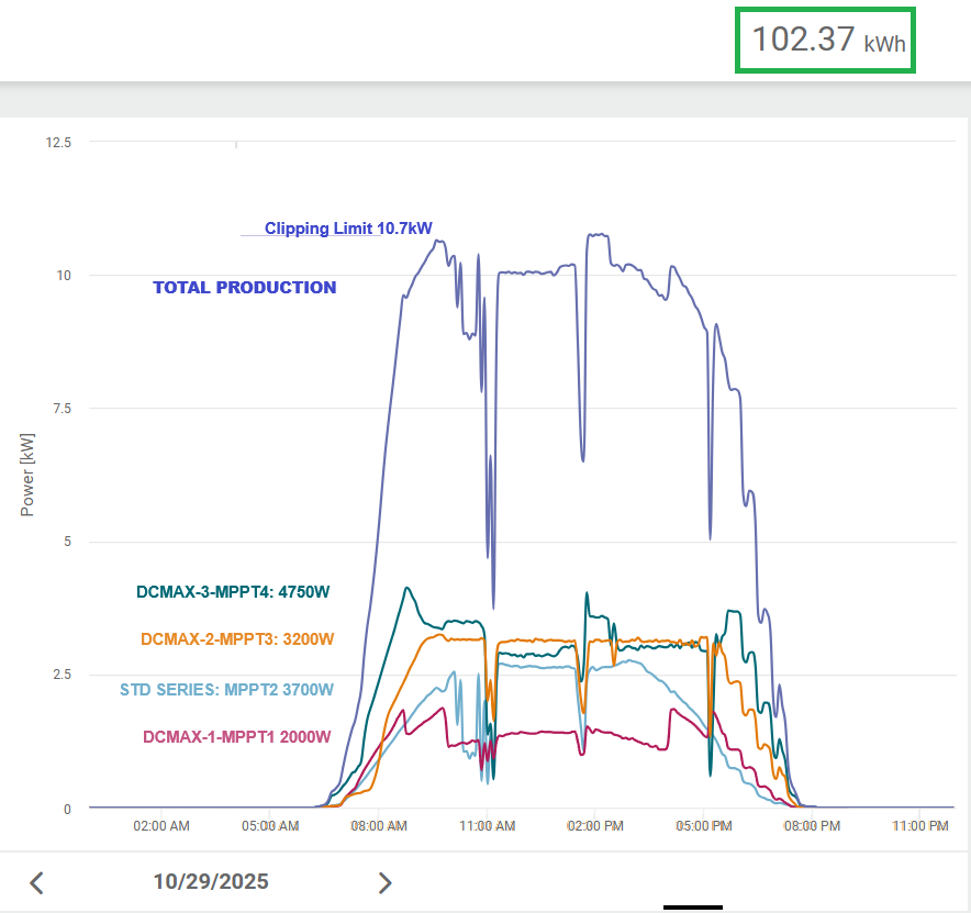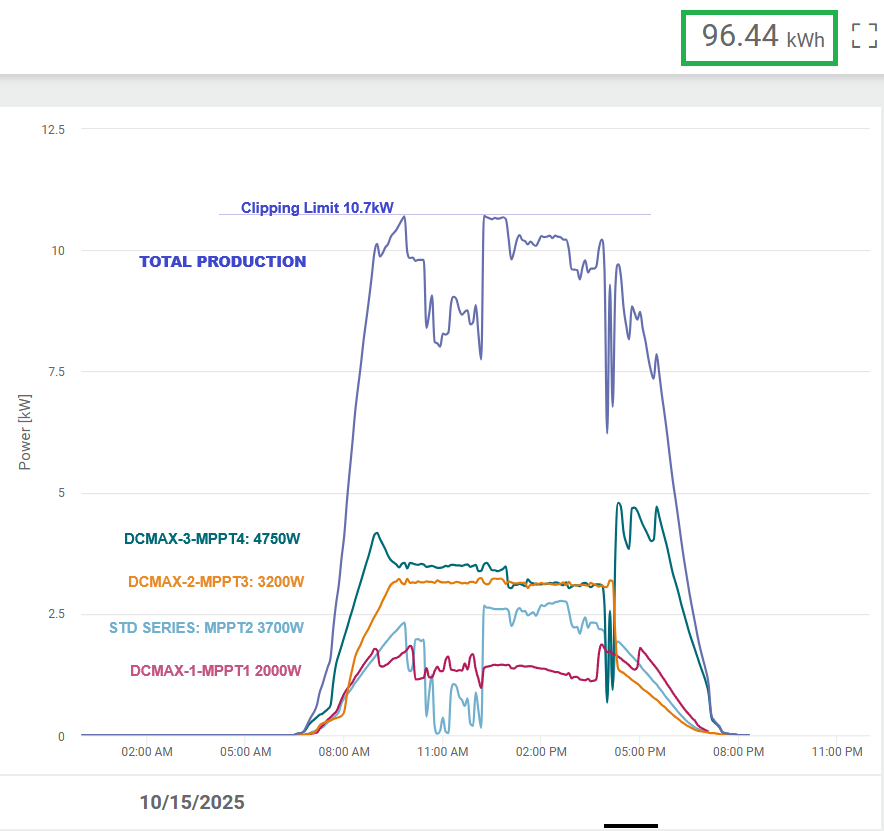 We are showing this years results against the 2022 year results for a comparison. The blue section indicates how much more the DCMax test site produced in 2025 over the 2022 results. Remember we have not changed the inverter or the rated value of the system. 10kW is the max inverter capacity allowed for single phase by the grid operator and the standard limits the oversizing to 13.33kW.