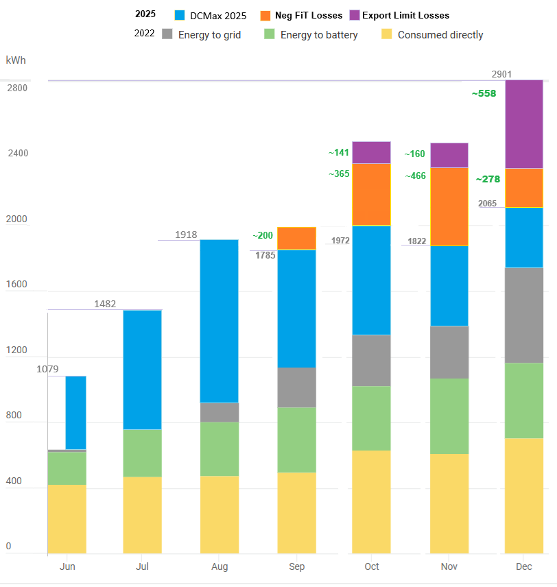With the DCMax fitted, we can expect the JUNE 2026 result to be at between 1200 and 1300Wh mark - very similar to the March result in previous years. This should provide sufficient energy for heating and EV charging eliminating the winter bill almost entirely.